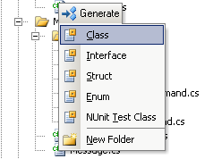 ReSharper поддерживает довольно много разных плюшек для генерации кода, большая часть которых доступна по Alt + Insert. Из Solution Explorer-а доступны шаблоны генерации классов/структур/перечислений (можно добавлять и изменять собственные шаблоны):
